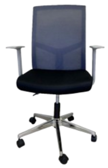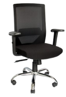 Respaldo de malla, asiento de tela importada, brazos fijos, base cromada