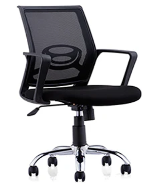 Respaldo de malla, asiento de tela importada, brazos fijos, base cromada