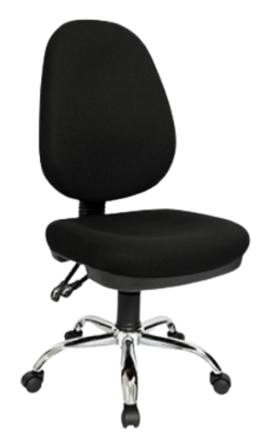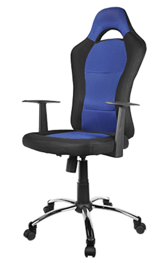 Respaldo con apoyacabeza y asiento de tela importada, brazos ajustables en altura, base cromada