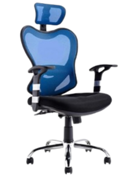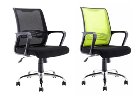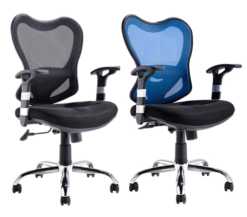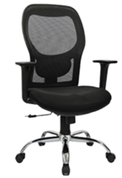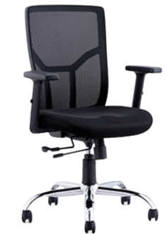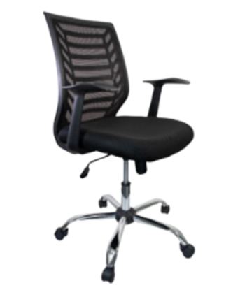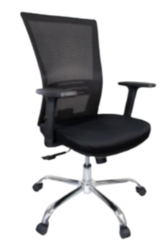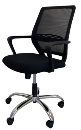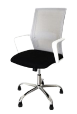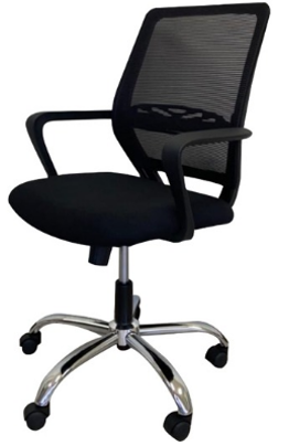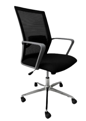Respaldo de malla, asiento de tela importada, brazos fijos, base cromada
