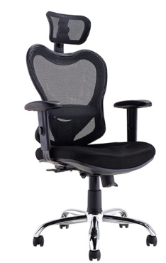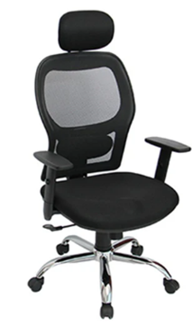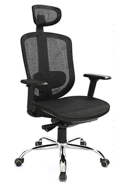 Respaldo de malla reclinable con soporte lumbar, asiento de tela importada, apoyacabeza ajustable en altura y ángulo de malla, brazos ajustables en altura, base cromada