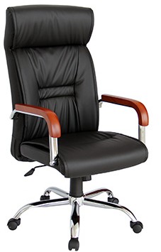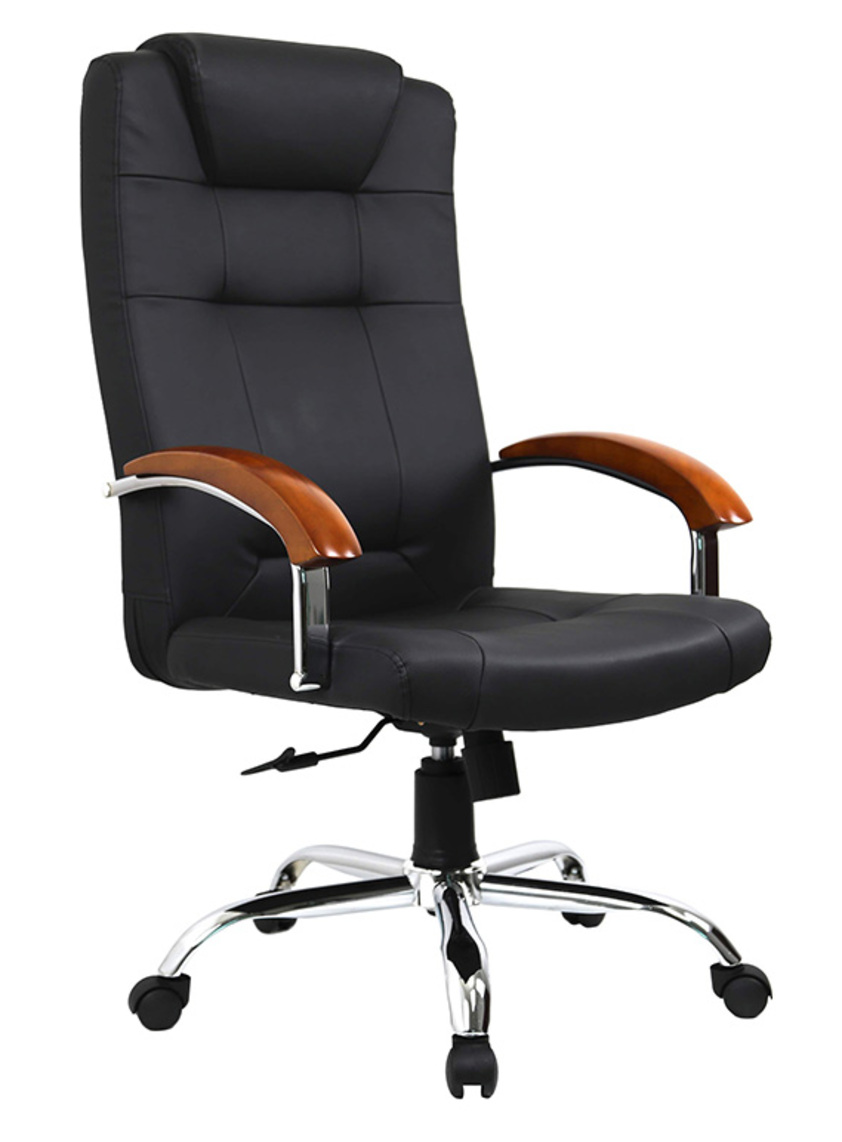 Respaldo con apoyacabeza y asiento de cuero (PU), brazo fijo de metal con madera, base cromada